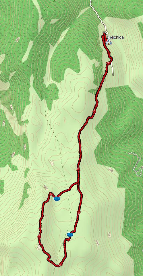 The mountain village Belichica (Belicica) is located a bit west of Lake Mavrovo in Mavrovo National Park. We parked at the end of the asphalt road. About 650 m from the end of the asphalt road, take an overgrown dirt road to the right. If you have reached the field with the war monument, you have gone too far. This first part was pretty overgrown in July 2019.