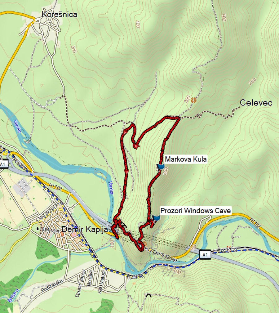 You can view and download the GPS track of this hike here: https://www.wikiloc.com/hiking-trails/demir-kapija-markova-kula-fortress-and-prozori-caves-237872504