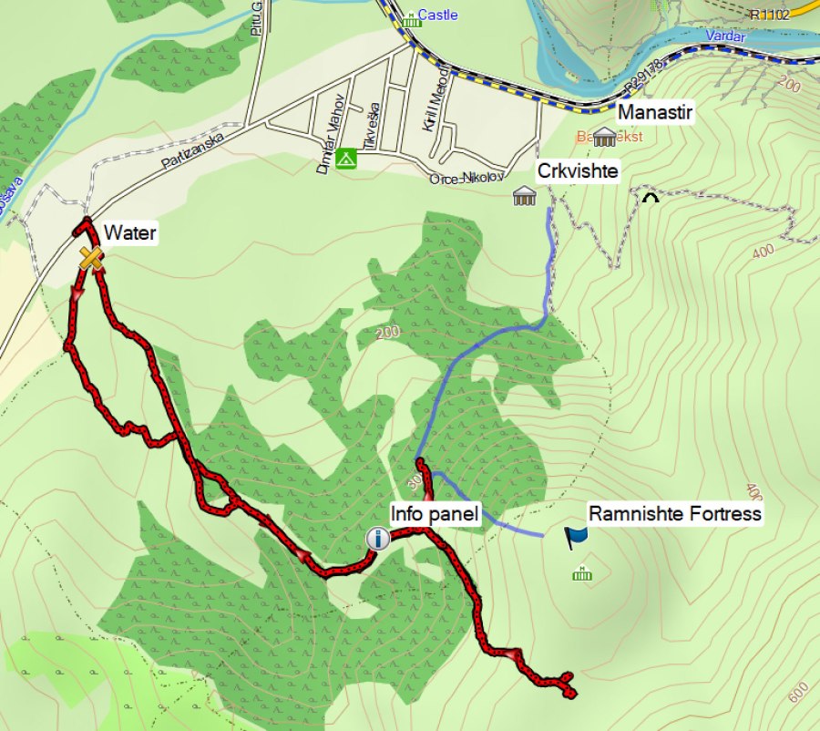 I continued following a trail (in red in the picture below), that also looked like the trail depicted on the information panels in the center of Demir Kapija. At a certain moment I completely lost the trail and the vegetation became very difficult to get through, and it was not clear at all how to get uphill to the fortress. So I gave up after a while. When comparing my trail (in red below) with the trail indicated on the info panel in Demir Kapija, it seems I should have turned left/north a bit earlier after the info panel.