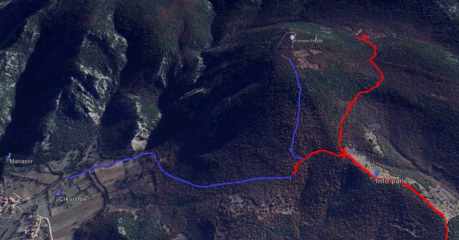 Retrospectively, the my second attempt with the trail going north looks like it almost connected with a possible trail to the fortress. I indicated this trail in blue on Google Earth; I did not walk the blue part myself. This blue trail also seems to be accessible from the archeological sites Crkvishte (Church) and Manastir (Monastery) that we visited as well, in case you want to give it a try from there.
