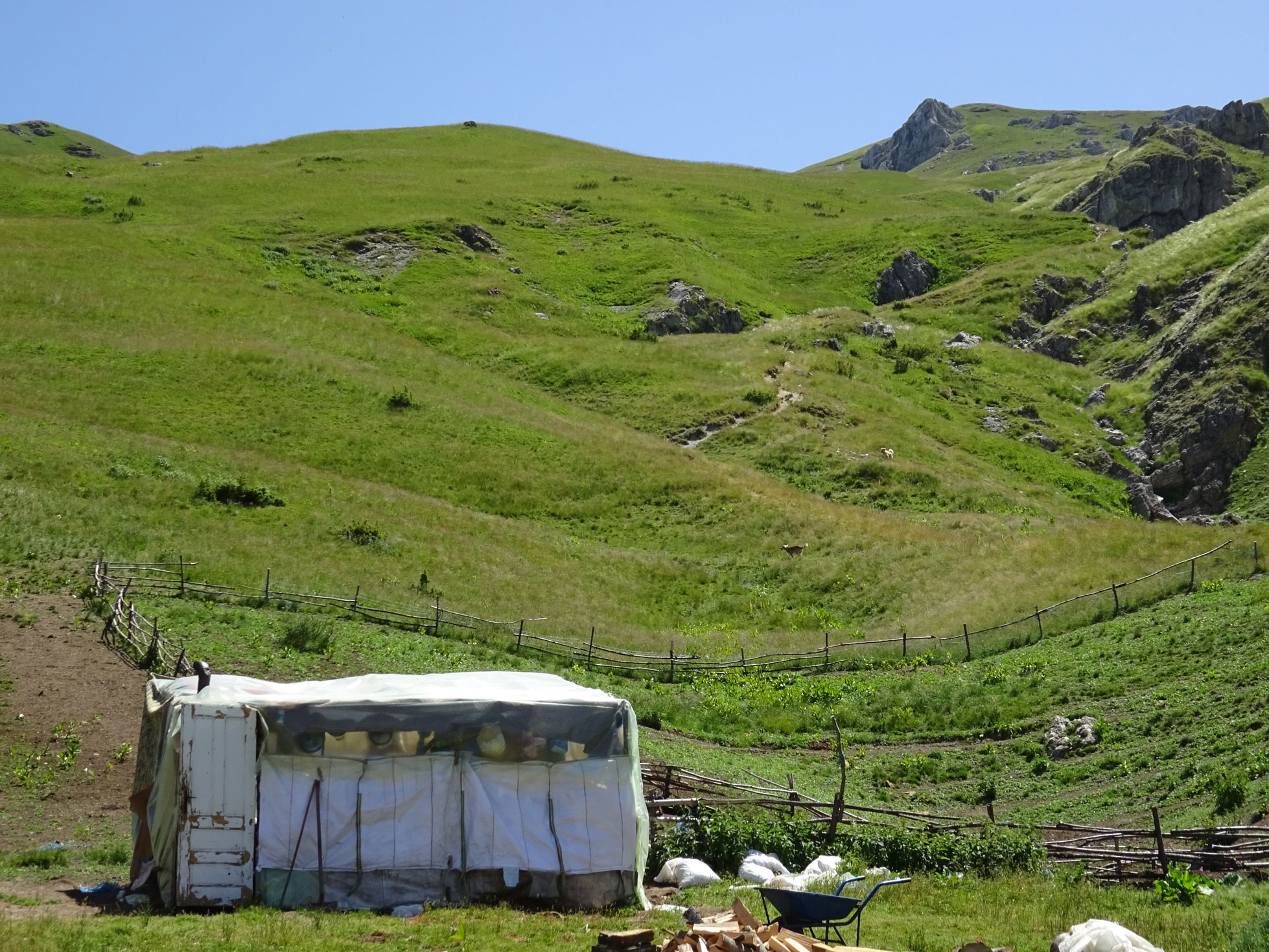 After about 3 km from the Babin Srt peak you reach a sheep farm. I’m always very careful around them because of the possible presence of the feared shepherd dogs. Since the sheepfarm looked deserted, I felt comfortable passing it. How stupid. When I stepped over a ditch, there were at least 4 Shepherd dogs enjoying the shadow of this ditch! Barking loudly they came after me. Luckily, the Albanian shepherd, alerted by the barking, came out of this shed and called off the dogs just before I was turned into dog food. However, now the shepherd dogs noticed my little dog companions and went after them. The Shepherd’s son helped calling them off and together we found black Geena hiding in a bush. No trace of Leon, the Shepherd’s son though he was not hurt but overheated from the escape and hiding somewhere else in a bush. I waited for half an hour, but still no Leon and I had to continue back to Gari. I suggest to avoid this sheep farm (and others) and walk with a big circle around them even when they appear deserted!