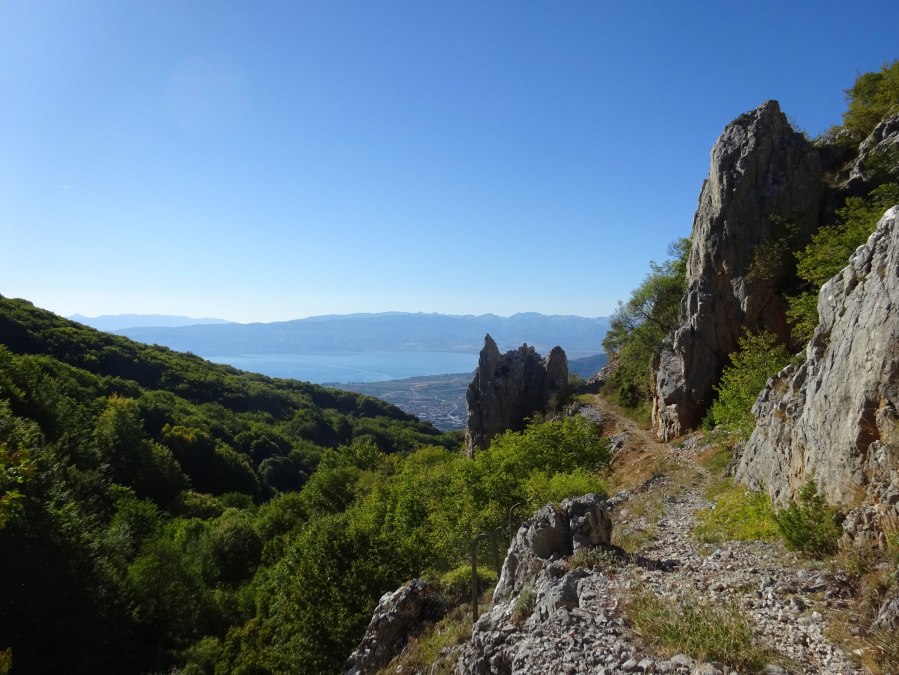 The first part is through forest, until you reach a very characteristic “rock gate” from where you have a good view of Lake Ohrid.