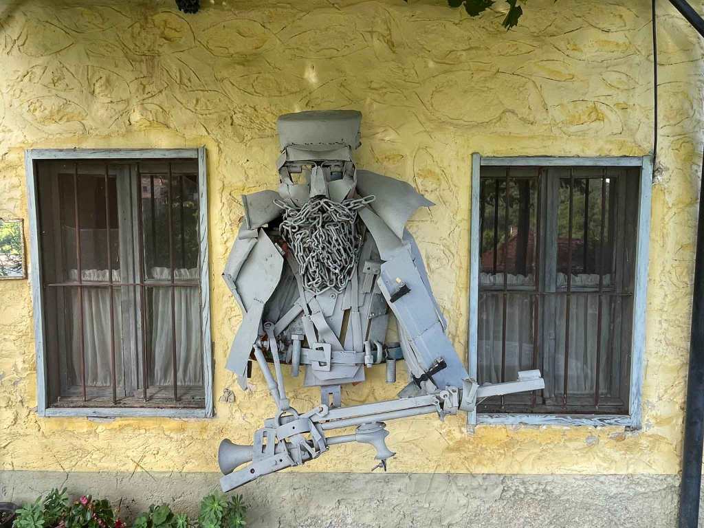 The last place that we visited on this sightseeing trip was the birth-house of Dame Gruev. Mounted on the wall of this yellow house is an interesting statue of Dame Gruev made from scrap metal.