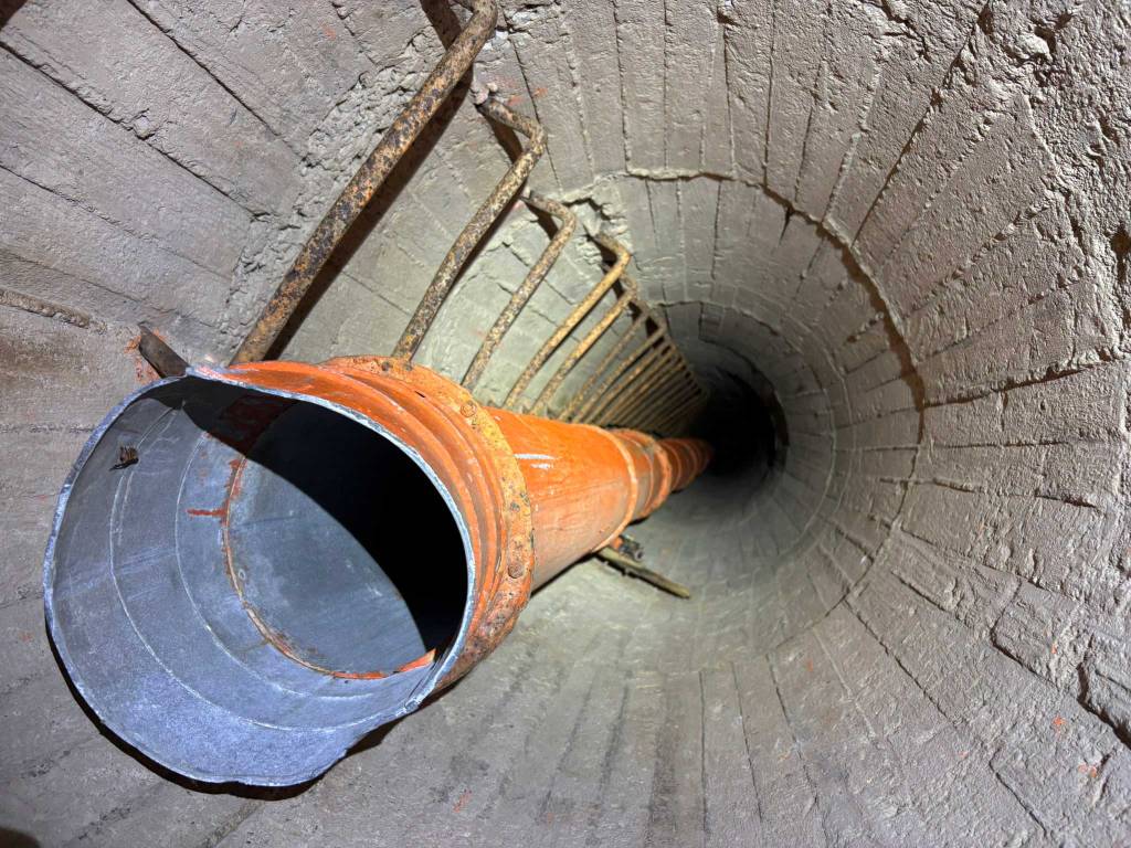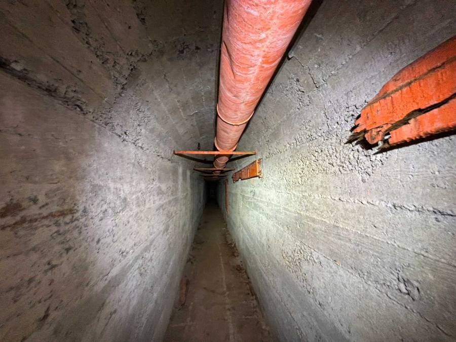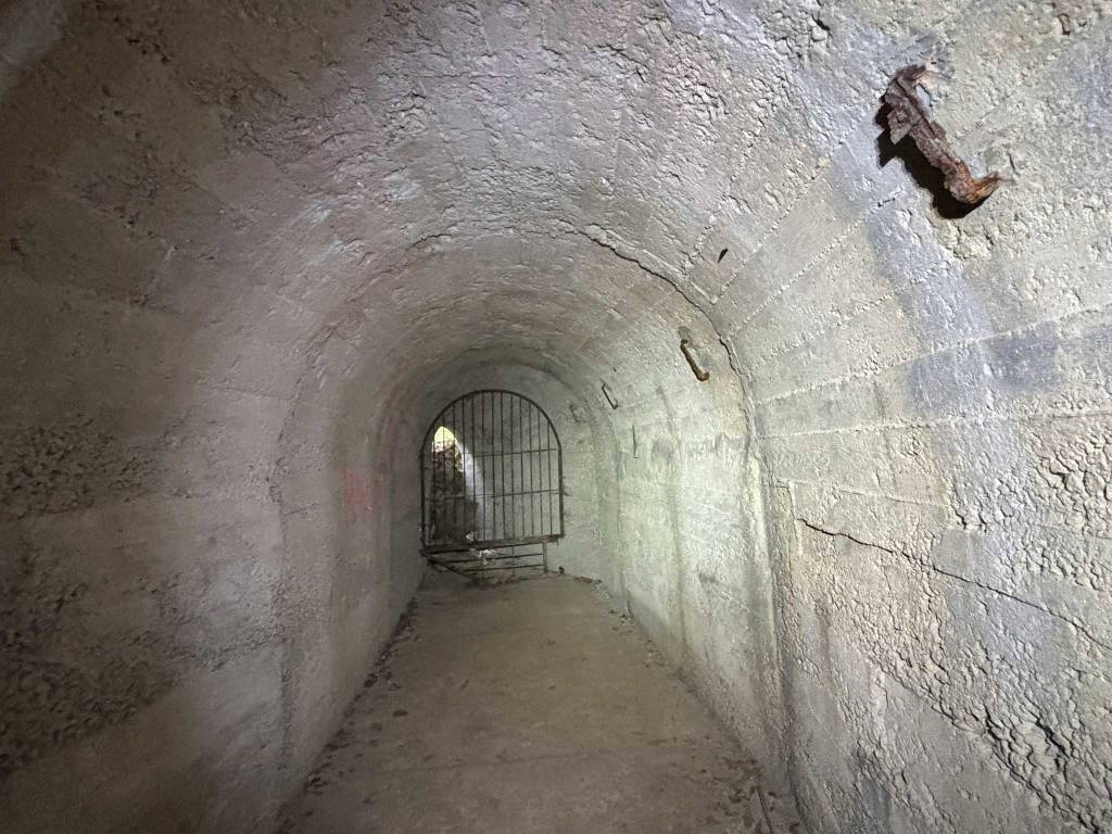 The entrance of the bunker is cleverly hidden behind a wooden shed. At the time of discovery the shed was hiding a heavy metal orange door that closed off an underground military bunker. The bunker consists of a labyrinth of tunnels and 10 rooms with wooden floors. When it was discovered the bunker contained cables for telephone, telegraph, ventilation, furniture, appliances etc. At the end of the tunnels there is a vertical ventilation shaft with stairs, likely an emergency exit. I didn’t climb up there. In one of the tunnels there is what looks like a concrete sink.