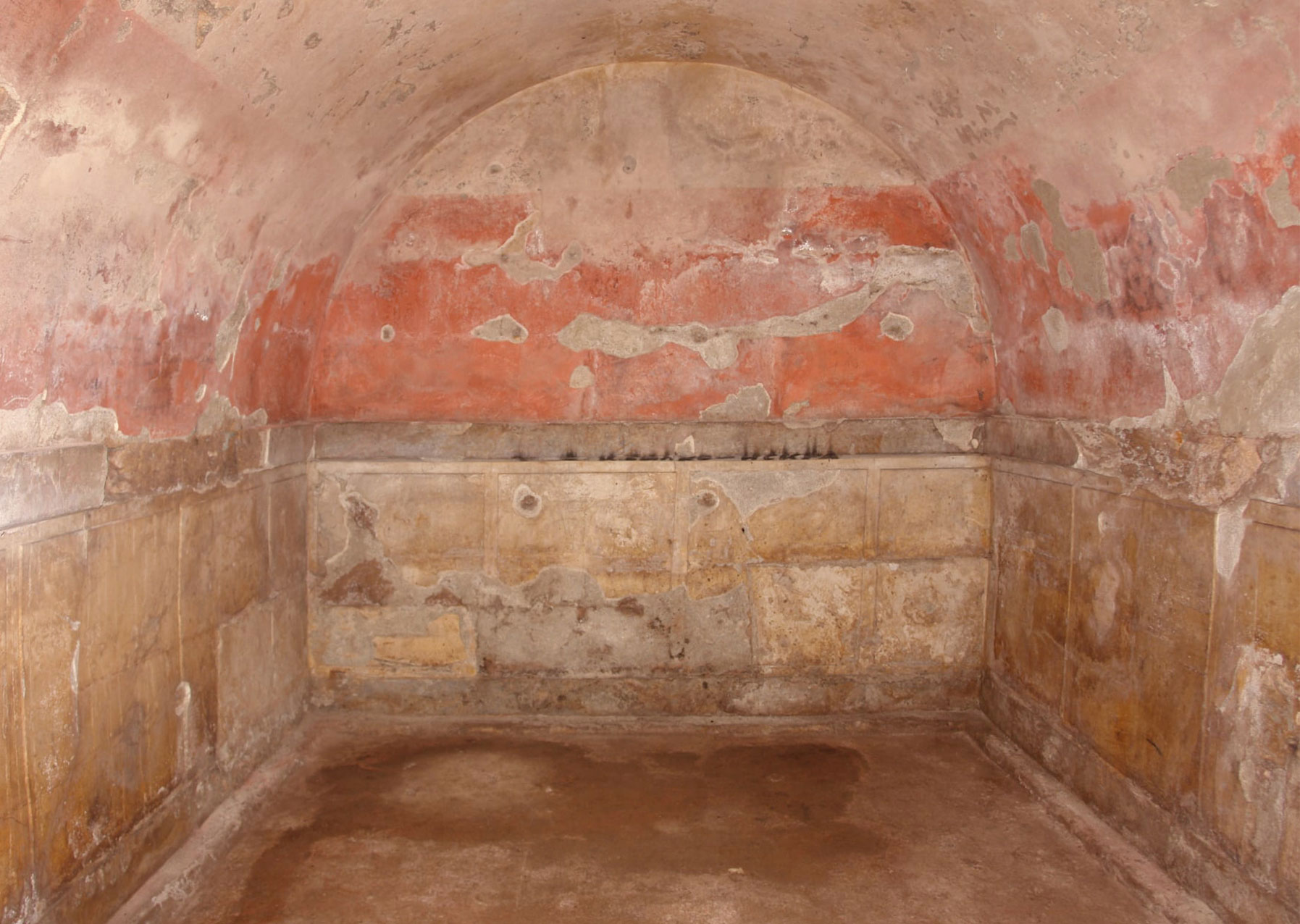A sign next to the tomb states that “the interior is richly decorated with imitations of marble and the characteristic Pompeian-red color. The tomb has a vaulted (arched) roof painted in blue, as an association with the sky. Traces of stone pedestals are found in the chamber, on which the bodies of the deceased were placed. The tomb is built after the example of the rich tombs of the Macedonian Kings, as the eternal resting place of a nobleman and his wife from the rich ancient city of Lychnidos (Ohrid)”.